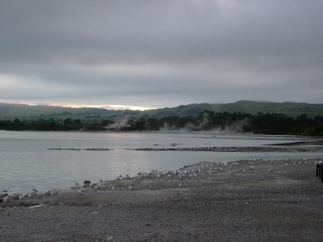 Lake Rotarua at dawn. Sulfur plumes.